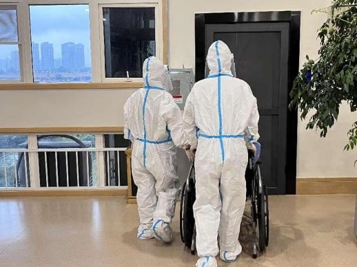 5、護(hù)士及醫(yī)生做好防護(hù)進(jìn)入發(fā)熱長者居室,幫助長者穿戴隔離衣并佩戴口罩,通過隔離轉(zhuǎn)運(yùn)專用電梯,將發(fā)熱患者轉(zhuǎn)移至負(fù)壓救護(hù)車內(nèi);